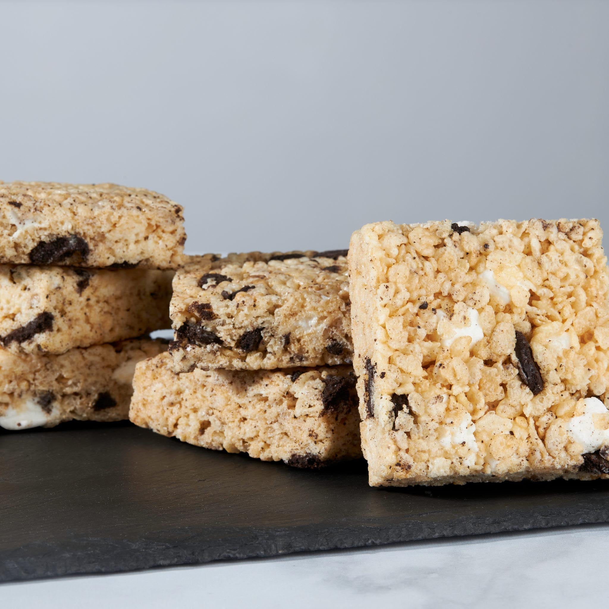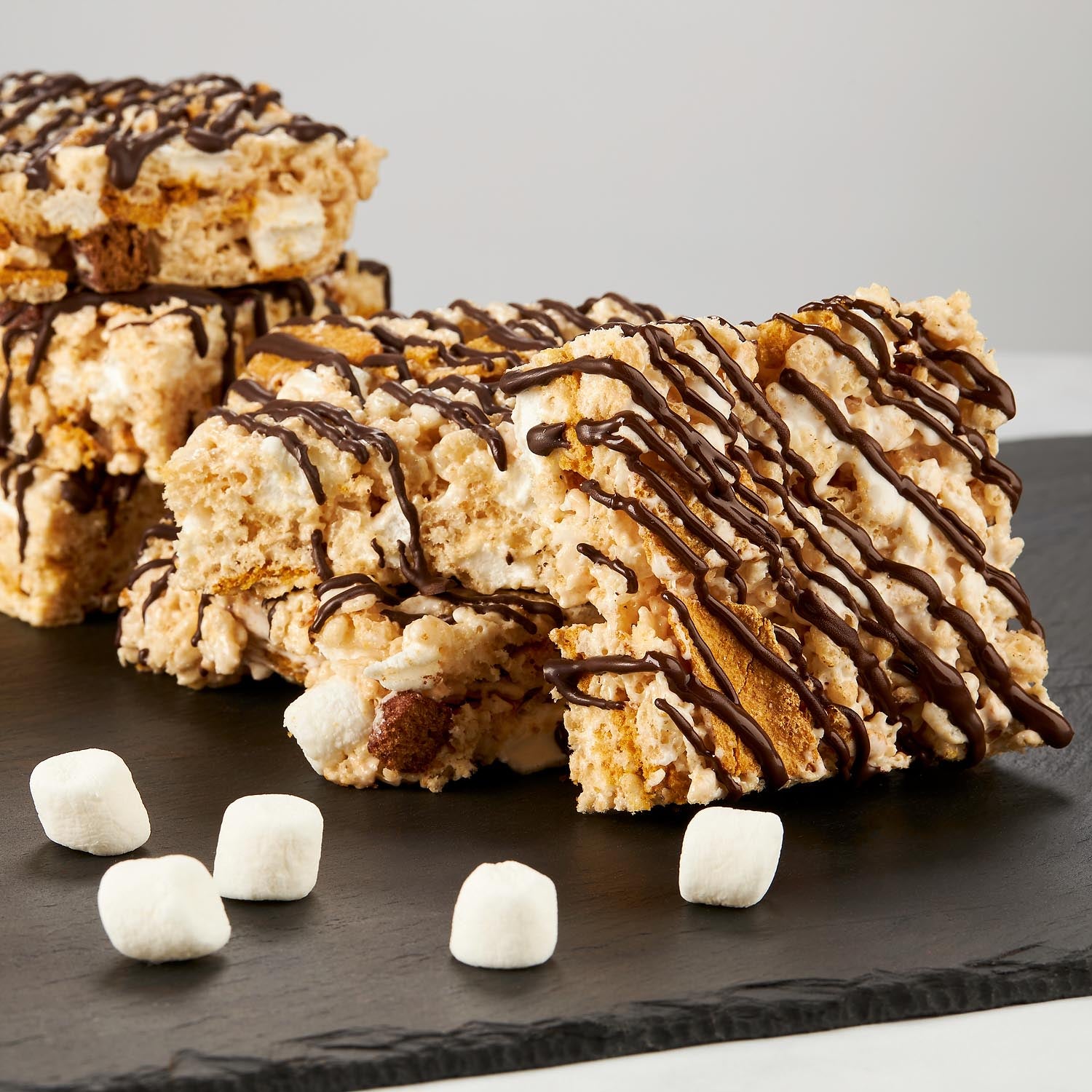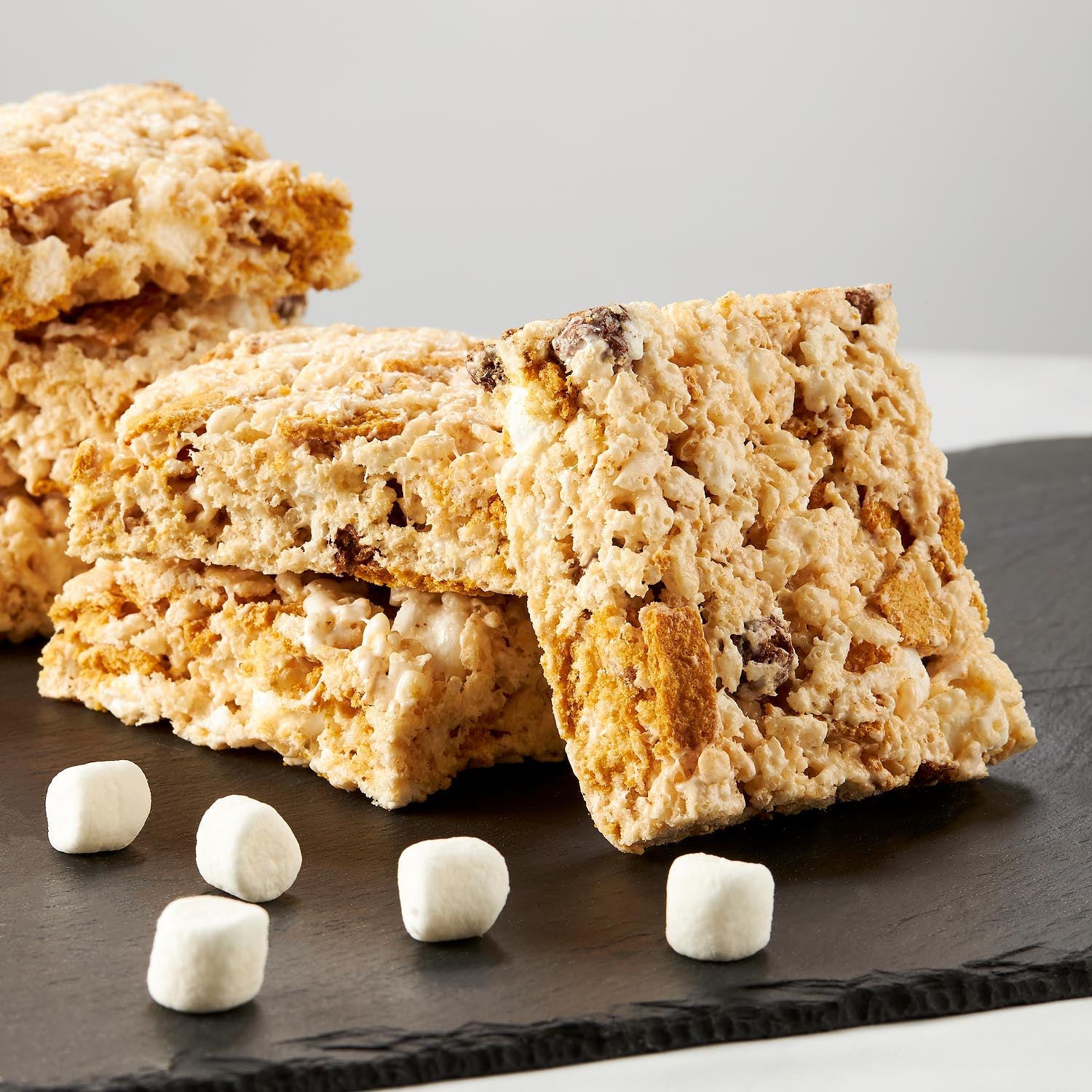 Our summer safe version of our S’More Crispie square is made with graham and chocolate cocoa cereal with mixed in marshmallows. It ships safely in the summer.