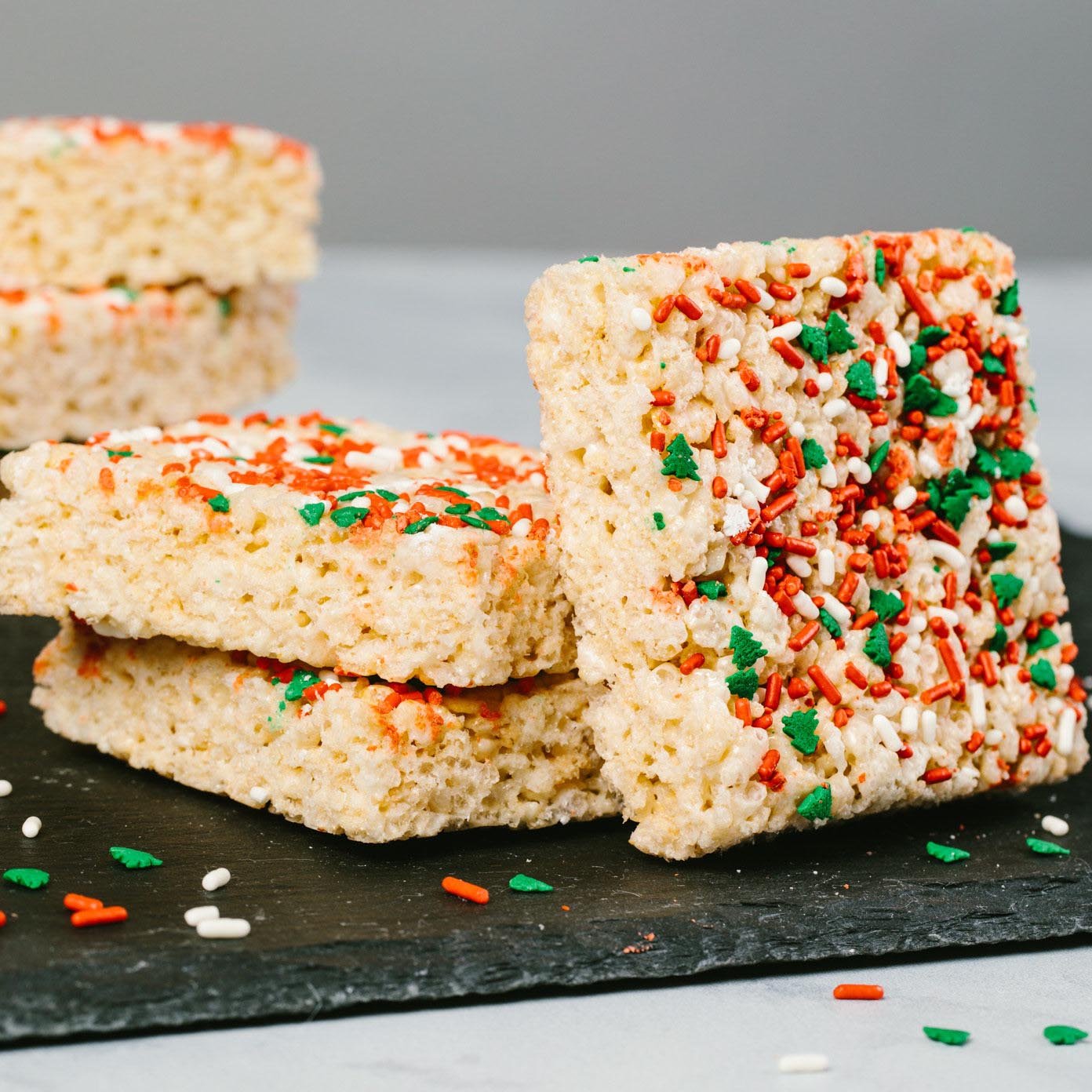 The sweetness of marshmallows and the familiar crunch of the crispy puffed rice come together in a treat that is handcrafted perfection! Topped with red and white decorettes and evergreen trees.