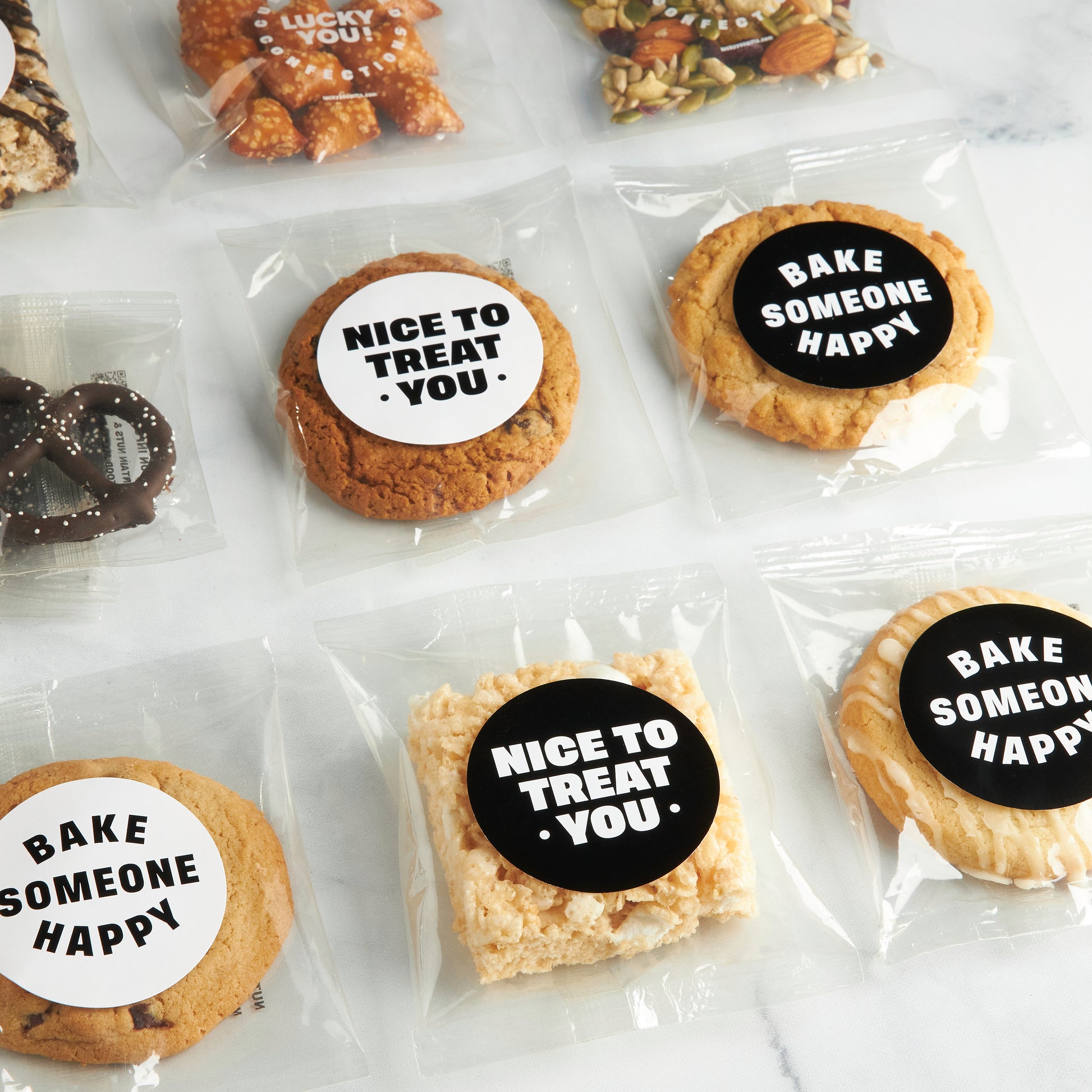 12 Popcorn, 6 Trail Mix, 8 Crispie Squares, 12 Baked Cookies, 6 Chocolate Enrobed Pretzels, & 19 Chocolate Enrobed Oreo cookies with nonpareil sprinkles.
